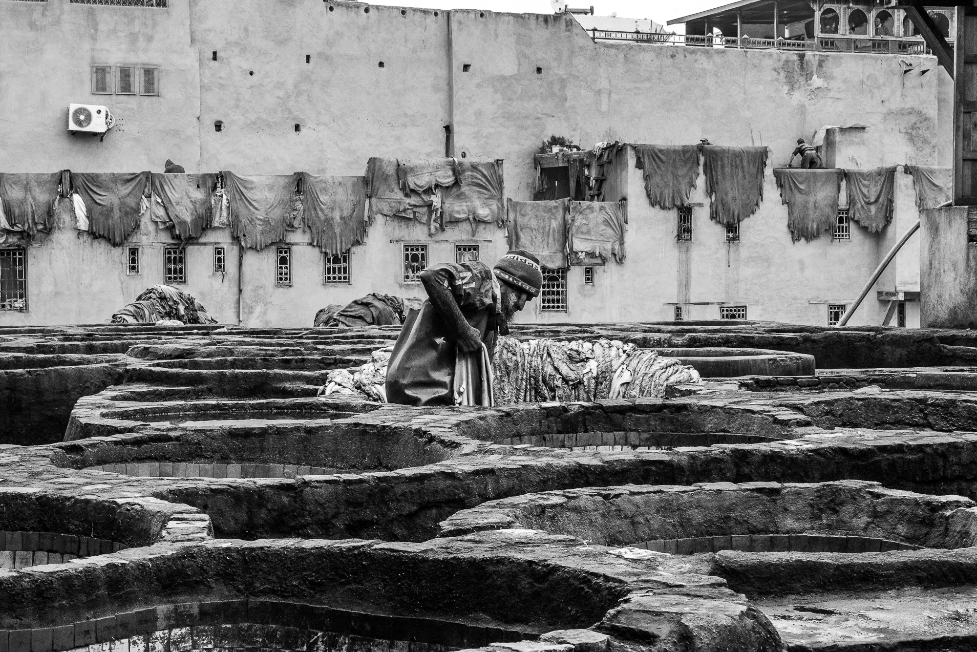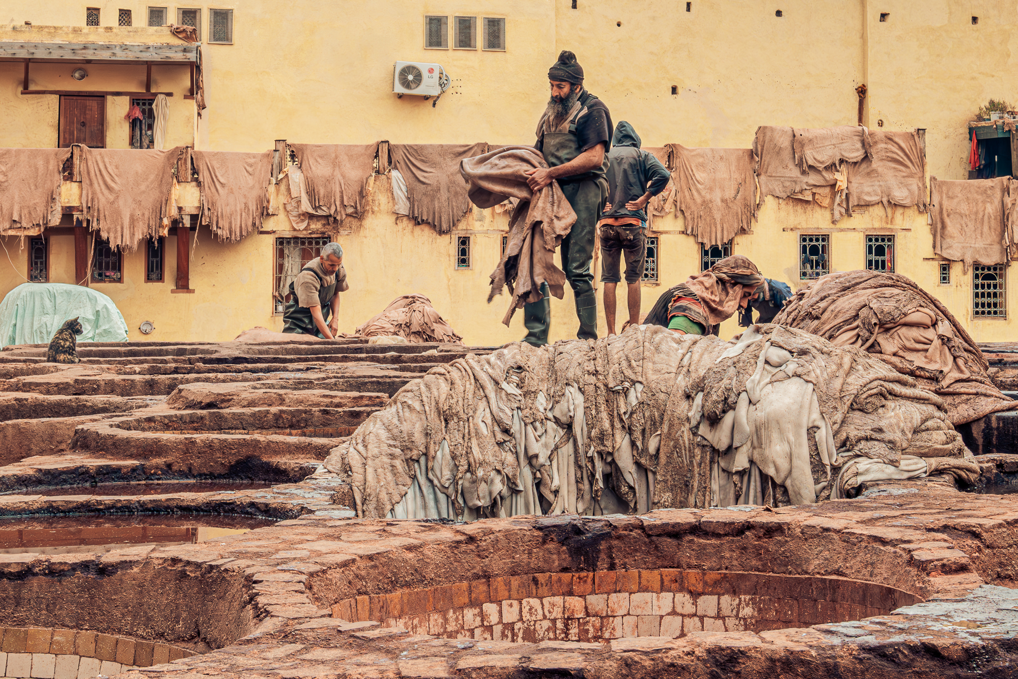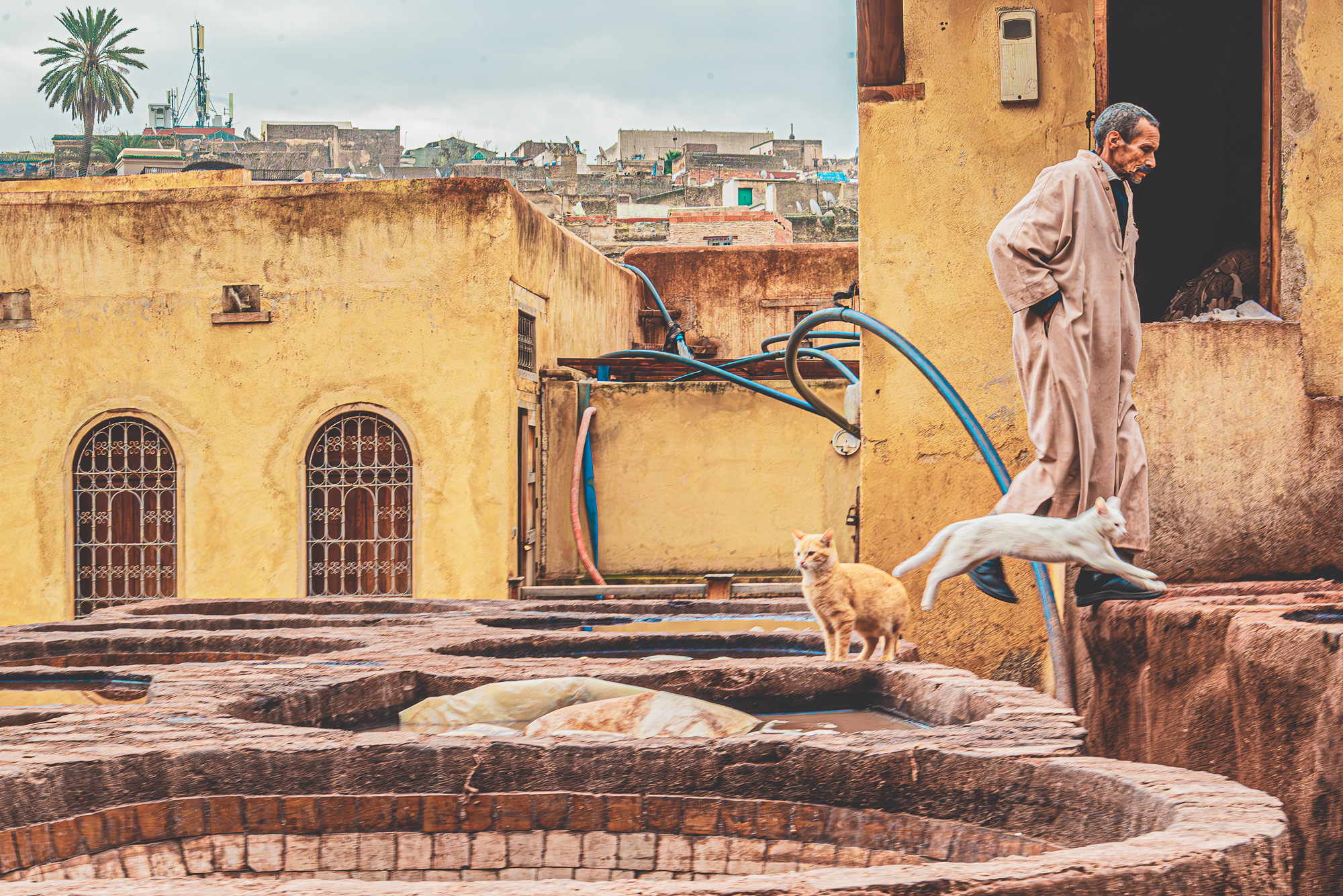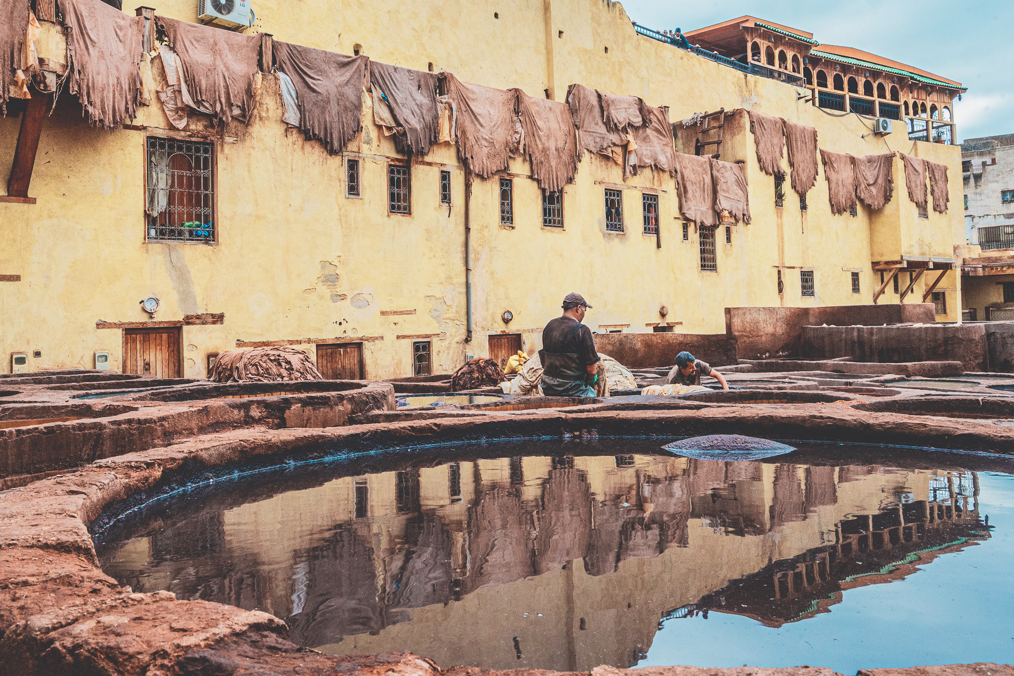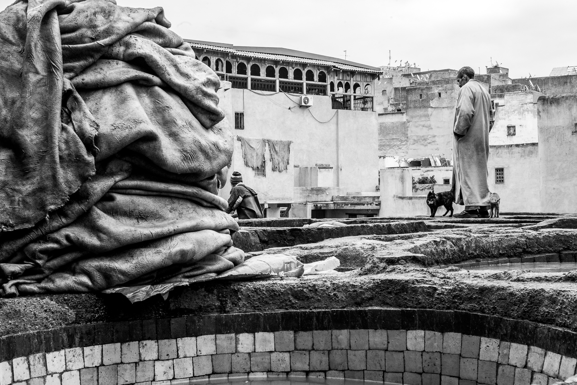 Queste sono alcune delle fotografie scattate nelle più antiche concerie di Fes. Luogo surreale dove le pelli vengono conciate a mani nude da uomini che si immergono nelle vasche. L'odore insopportabile per chi no è del posto... gatti in cerca di cibo... ed i conciatori che ci guardavano con la stessa curiosità con cui li guardavamo noi.